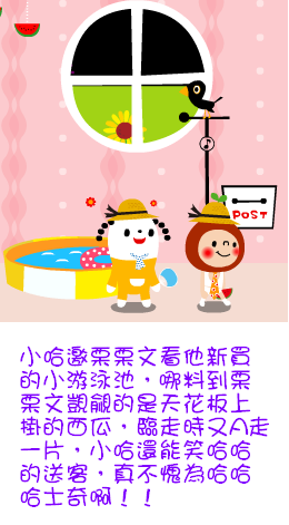 所以囉,當栗栗文去小哈家參觀,本來是要去看小游泳池,天知道那個愛吃西瓜的傢伙,竟然把小哈家新買的西瓜吊飾給挖了一片西瓜下來,你們可以去小哈家數一數,吊飾是不是少了一片啊!!